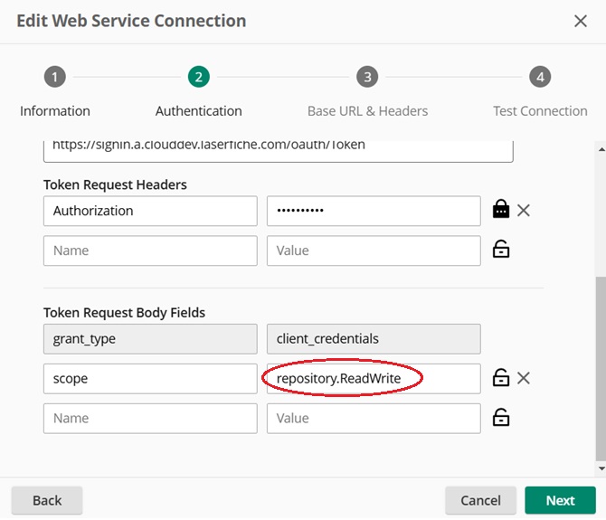Note: The security scopes required by the Web Request Rules, for example repository.Read repository.Write project/Global table.Read table.Write must be configured both in the Service App and in the Web Service Connection. For more information see OAuth 2.0 Scopes for Laserfiche APIs.