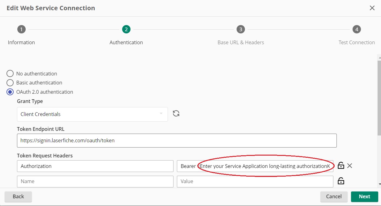 Follow the steps below to obtain the credentials needed to configure Web Service Connections used by Web Request Rules to access Laserfiche Cloud APIs: